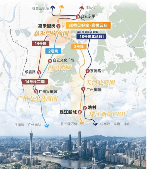 该区域是轨道无缝连接的典范,通过嘉禾望岗枢纽可 0 换乘联通白云机场、广州南站、广州火车站、广州东站四大超级枢纽,同时直连天河北、体育西、珠江新城等八大核心商圈,无需换乘即可通达广州核心区域,交通能级在全国实属罕见。