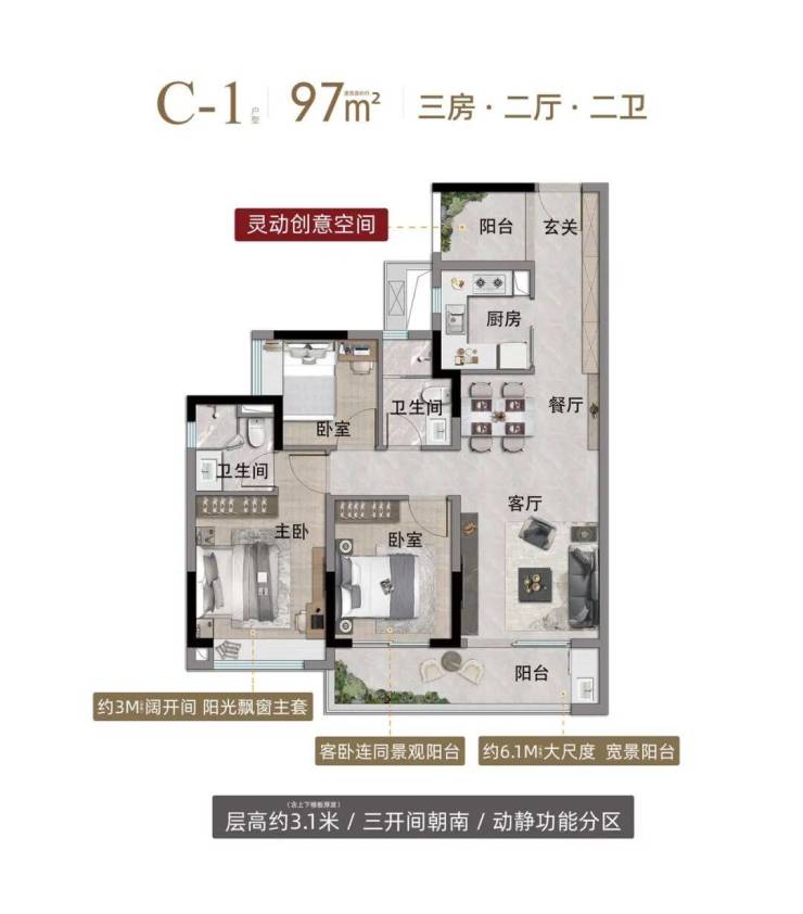 约3.1米层高,约6.1-9.4米宽景阳台,采光通风极佳。