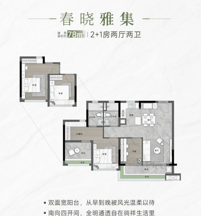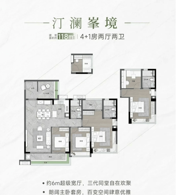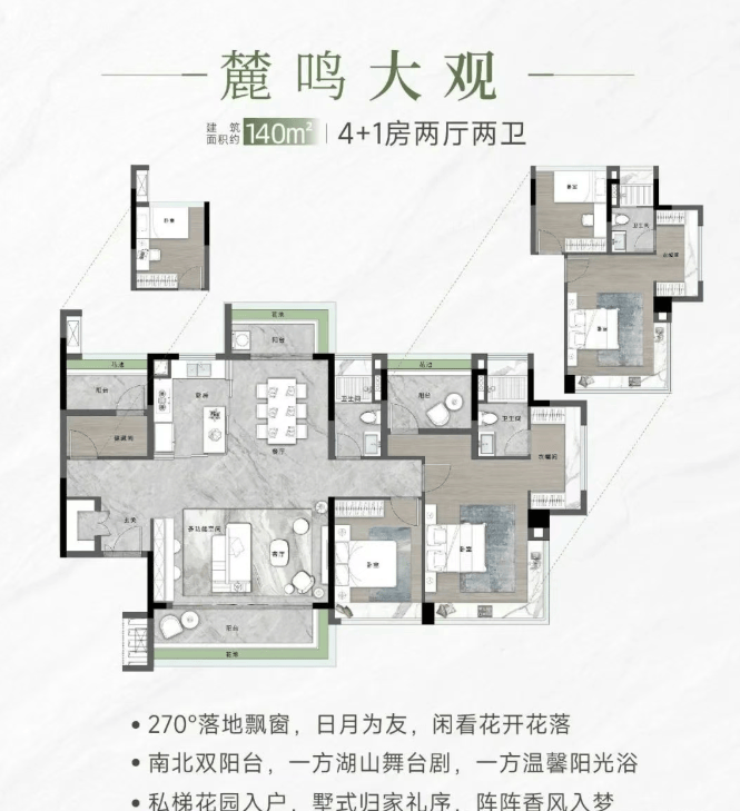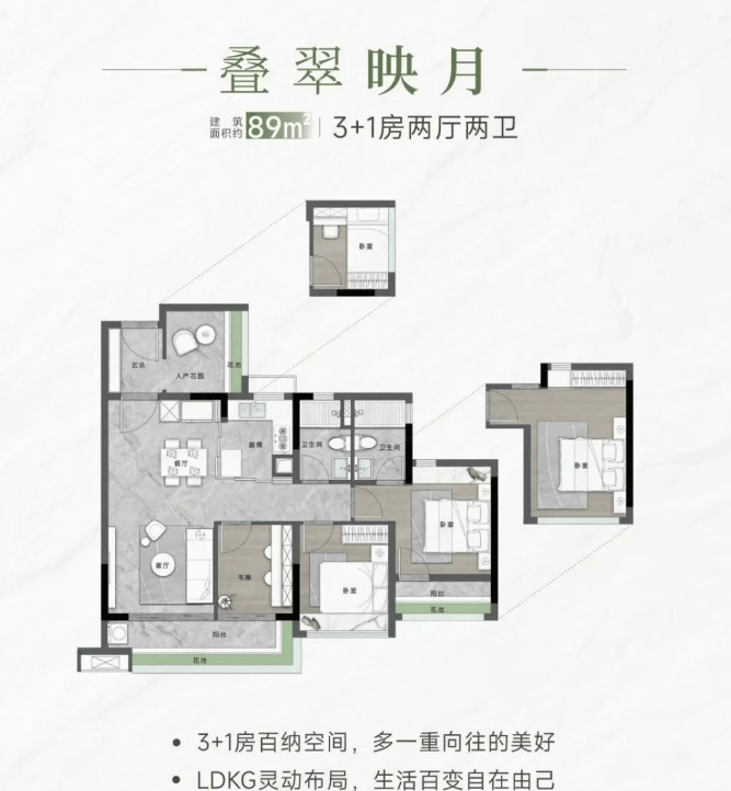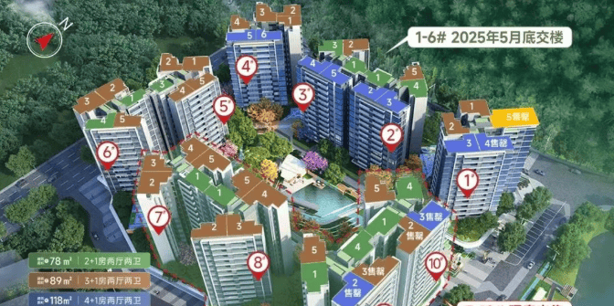 项目提供多种户型选择,包括约78㎡的2+1房、约89㎡的3+1房、约118㎡的4+1房以及约140㎡的4+1房等多种户型。所有户型均采用LDKG一体化设计,配备超宽双面阳台,提供开阔的景观视野,满足不同家庭的需求。