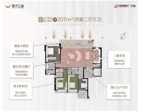 3. 6、7栋:在售户型面积为207㎡四房,户型方正,采光通风好,江景视野优越,适配中型改善家庭;