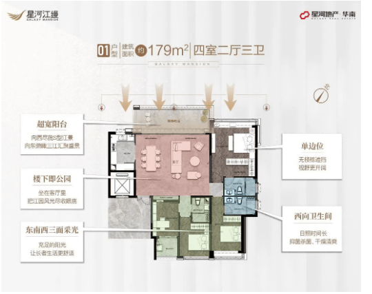 1. 1、2、3栋:在售户型面积均为179㎡四房,户型设计合理,南北通透,采光通风俱佳,能够满足改善型家庭的基本居住需求,圈层纯粹;