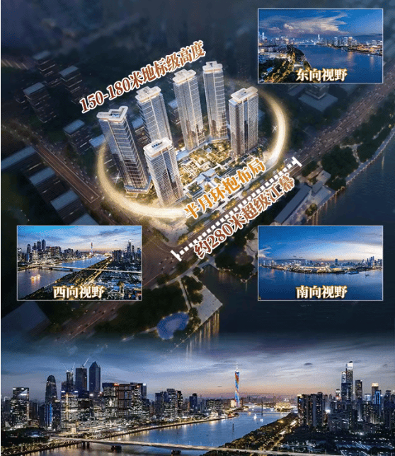 答:项目采用北高南低半月型布局,后排楼栋适当扭转,实现 100% 户型望江;前排 1/9 栋为一线头排江景,6/8 栋垂直望江,3/5 栋斜出江景,结合超宽楼间距与大面宽阳台设计,确保每一户都能享受到珠江景观,尤其高层户型可俯瞰珠江夜景与城市天际线。
