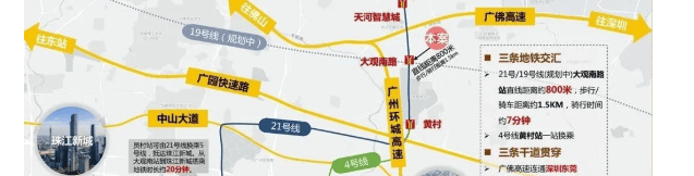 地铁:临近地铁 21 号线、4 号线及规划中的 19 号线。21 号线大观南站直线距离约 800 米,向西 5 站到 5 号线员村,转乘 2 站可到珠江新城,方便前往广州核心商务区;向东 3 站到科学城,对接科技创新产业区。4 号线黄村站直线距离约 1500 米,2 站到车陂南,4 站到珠江新城,南北贯穿广州主城动脉,方便出行。规划中的 19 号线全长 34.2km,覆盖衔接广佛,未来将进一步提升区域交通便利性,加强与佛山等地的联系。