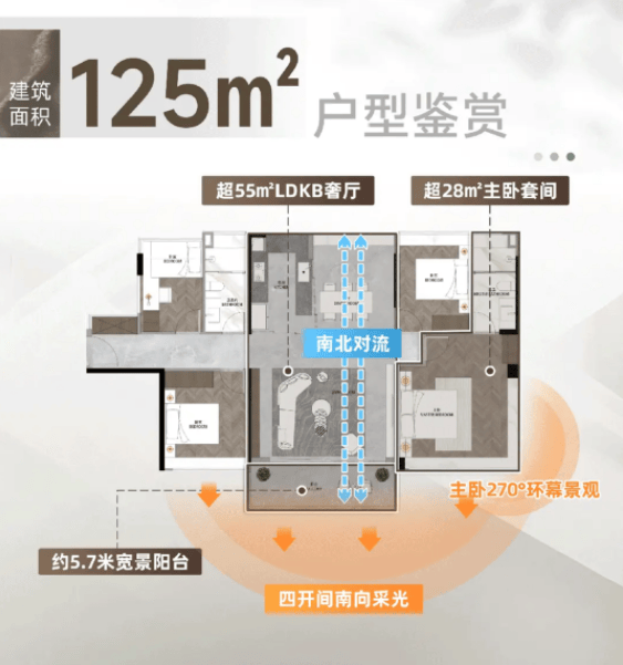 建面约125㎡的四房两厅两卫,总价625万起,南北通透,空气对流效果好。U型厨房操作便捷,适合成长型家庭。四个房间的设计,满足了二孩家庭或与父母同住的需求,每个人都有独立的私人空间。
