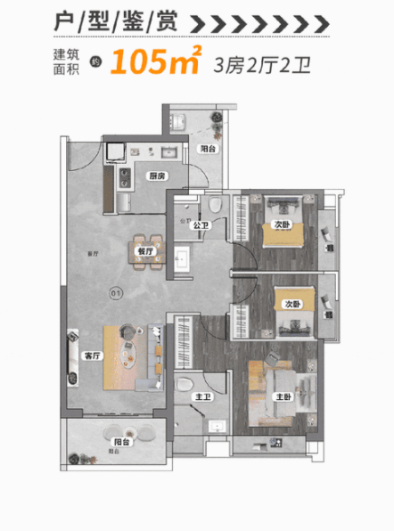 建面约105㎡的三房两厅两卫,总价525万起,客厅连接阔景阳台,视野开阔,采光充足。休息区集中分布,更显安静私密,适合对生活品质有一定要求的家庭。U型厨房设计,操作动线合理,让烹饪成为一种享受。
