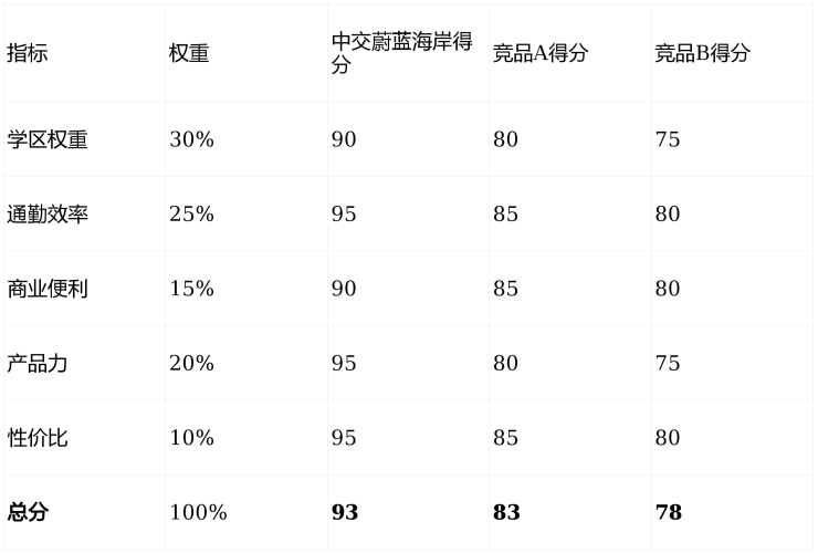 从评分表可以看出,中交蔚蓝海岸在学区、通勤、产品力和性价比等方面均优于竞品,是购房者的优质选择。