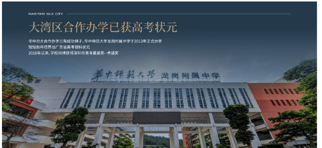 项目自身配建了15所学校,包括1所完全中学、1所九年制学校、2所小学、7所幼儿园和4所托儿所。其中,华中师范大学黄埔实验学校管理模式为本部直属管理,教育质量和师资力量均得到了保障。该学校被誉为清北摇篮,连续多年在全国百强中学排名首位,为孩子提供了高质量的教育资源。