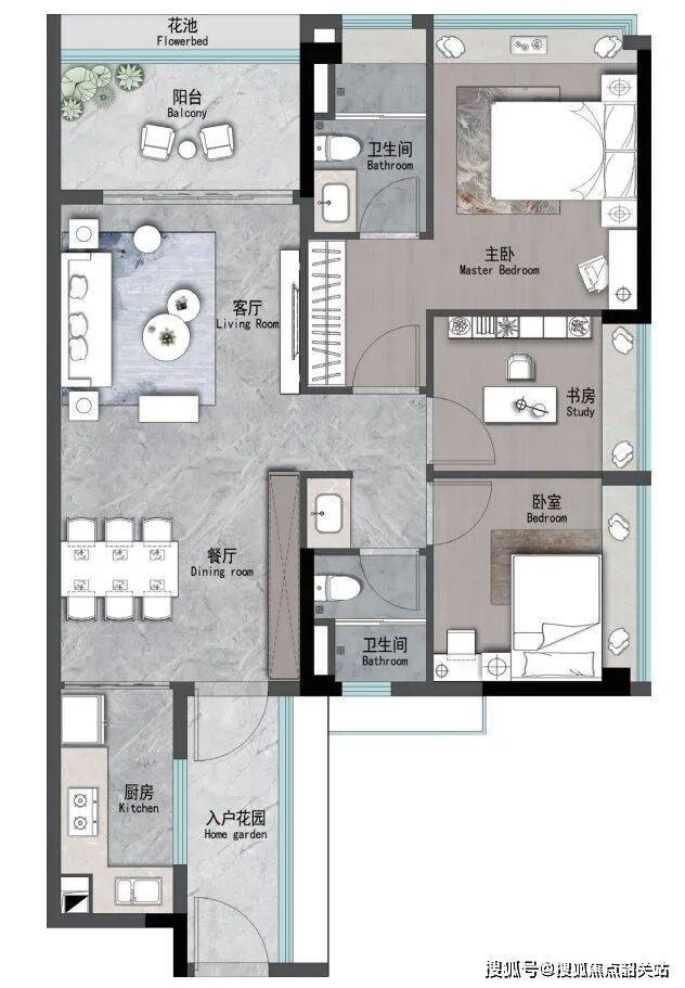 建面约120㎡四房:南北通透+双阳台,主卧270°环幕景观,适合二胎家庭;
