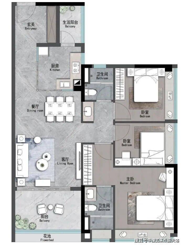 建面约90㎡三房:三开间朝南+主卧套房,得房率超85%,适合三口之家;