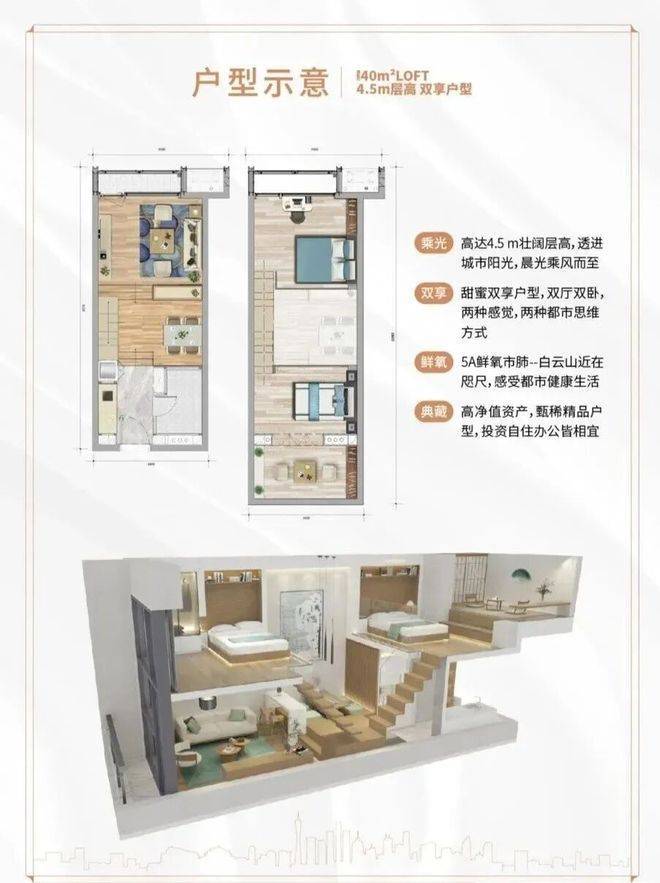 户型设计是这个项目的一大亮点。主推的31-57㎡区间,走的都是精致小户型路线,但因为是LOFT复式,实际使用空间被放大不少。层高有3.4米、3.6米和4.5米几种选择,其中4.5米挑高的那一档最吸睛,中空设计让空间感直接拉满。同样37㎡的面积,做成LOFT后,一层可以当客厅+开放式厨房,二层做卧室+衣帽间,甚至还能隔出独立书房或工作区。自住的话住着不憋屈,办公的话放两张桌子也游刃有余,投资出租的话因为户型小、总价低、好打理,也容易找到稳定客群。毛坯交付给了买家最大的自由度,想做日式极简、北欧风还是工业风,都能随心所欲改。