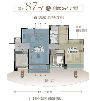 建面约 87㎡的户型分为 A、B 两个版本,均为三房两卫设计,完美适配刚需家庭。其中 87A 户型做到四开间朝南、南北通透,约 3.8 米的奢阔横厅连通景观阳台,在家就能尽览园林美景,部分房源还能实现望江揽园的双重视野;87B 户型则打造了罕见的 4.9 米宽幕客厅,23㎡的酒店套房式主卧自带独立卫浴和观景飘窗,且占据央景中轴位置,居住舒适度直接拉满。