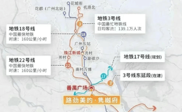 项目距离地铁 3 号线番禺广场站仅 800-900 米,这里是番禺重要的交通枢纽,除了已开通的 3 号线、18 号线、22 号线,还有规划中的 17 号线,四条地铁线路交织成网。乘坐 3 号线可直达珠江新城、天河商圈;18 号线作为 “广州最快地铁”,能快速通达琶洲、南沙;22 号线则串联起番禺、荔湾等区域,不管是通勤还是跨区出行都十分便捷。