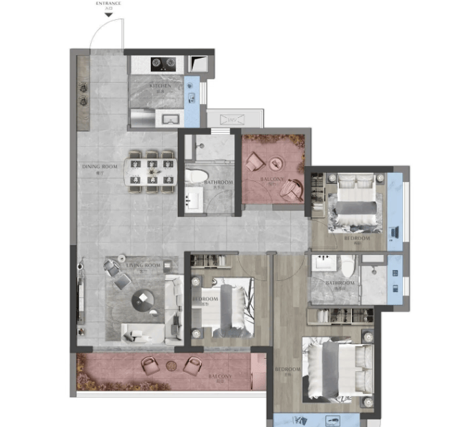 135-143㎡四房两厅两卫:改善主力户型,阔绰四房、大阳台、大主卧,适配二胎家庭、三代同堂,部分房源 270° 瞰江,景观视野绝佳;