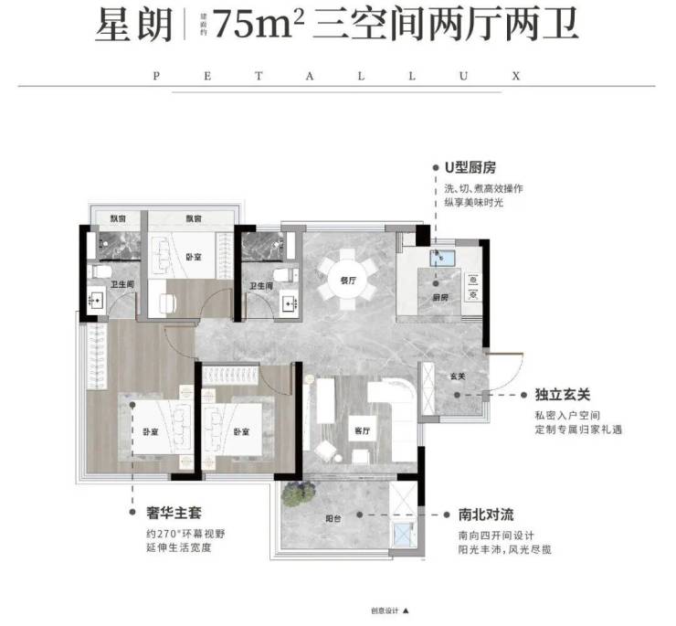 75㎡三房:独立玄关、U型厨房、南北对流,空间利用率媲美市场90㎡户型;