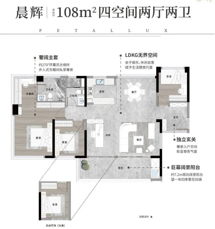 108㎡四房:15米南向面宽+7.2米阔景阳台,尽享阳光与视野。
