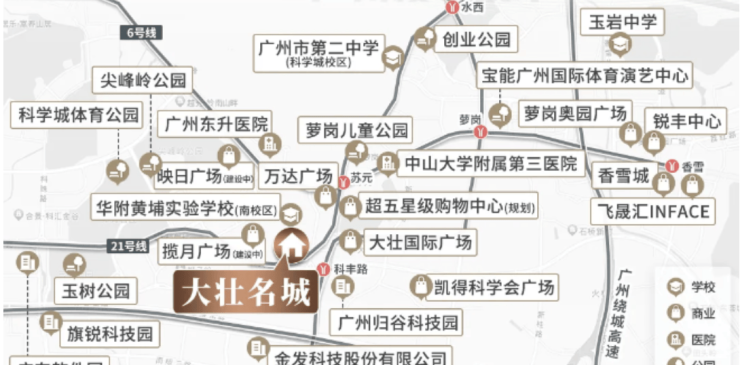 大壮名城·名门周边生活配套丰富且高端。教育方面,项目自带九年一贯制华师附黄埔实验学校,学位确定性强,距离项目步行即可到达,便于家长接送。科学城区域内还聚集了超过20所学校,包括市二中、玉岩中学等老牌教育机构,为家庭子女提供从小学到高中的优质教育保障。商业配套方面,项目十分钟内可到达万达广场、科学城商业广场及至泰广场等核心商圈,未来大壮国际广场A/B地块将打造超五星级购物中心,对标太古汇,为业主提供高端购物体验。周边规划还有映日广场、揽月广场、腾达广场等,商业总建面近200万平方米,相当于五个萝岗万达规模,能够满足多层次消费需求。医疗资源方面,广州东升医院及中山大学附属第三医院岭南医院均在项目周边,二期工程斥资扩建后预计提供更多高端医疗服务,保障家庭健康。社区临近香雪公园、体育公园、创业公园等城市绿地,形成生态休闲圈,居民可轻松享受运动与自然景观的结合。