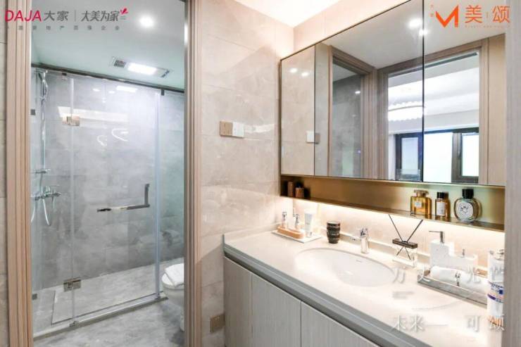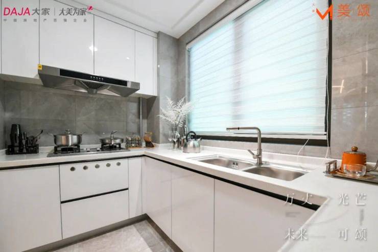 U 型厨房搭配双水槽与可拉伸水龙头,卫浴带大容量镜柜收纳,全屋搭载智能门锁、一键灯光、智能安防系统,大面积开窗提升采光与视野。