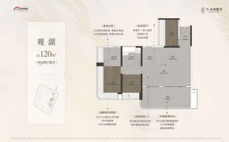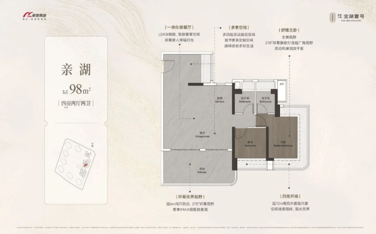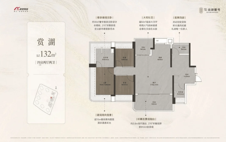 这款户型专为改善型购房者打造,2 梯 4 户的配置减少了候梯时间,提升了居住的便捷性与尊崇感。部分房源能远眺金山湖景,在家就能欣赏到湖光山色,享受自然与生活的完美融合。