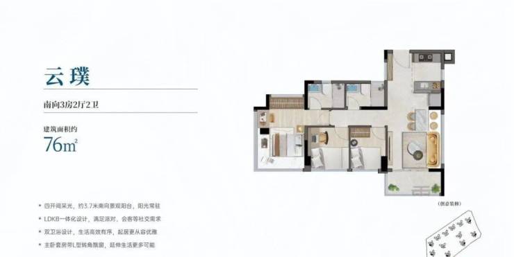 建面约76㎡三房两厅两卫:这是项目的刚需主力户型,虽然面积不大,但实用率超高,可达102%,完全能满足三口之家的居住需求。全南向设计,采光极佳,客厅连接宽景阳台,视野开阔;三个卧室均朝南,空间宽敞明亮,其中主卧带独立卫生间,保证了业主的隐私;灵动拓展空间可以改造成书房或儿童房,满足家庭的多样化需求;动静分区合理,公共区域与私密区域互不干扰,日常居住十分舒适。这个户型非常适合刚需年轻夫妻,总价低、压力小,同时又能拥有良好的居住体验,性价比拉满。