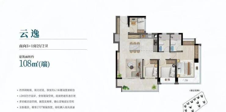 建面约108㎡四房两厅两卫:这是项目的改善主力户型之一,实用率可达108%,适合四口之家居住。全南向设计,四开间大面宽,采光和通风效果极佳;客厅宽敞明亮,连接宽景阳台,视野开阔,适合家人日常活动、接待客人;四个卧室空间宽敞,其中主卧带独立卫生间和衣帽间,提升居住的舒适度和私密性;灵动拓展空间可以改造成儿童房、书房或储物间,满足多孩家庭的需求;厨房采用U型设计,操作空间宽敞,方便家人烹饪;动静分区合理,公共区域与私密区域互不干扰,让家人既能享受欢聚的时光,又能保证休息的安静。