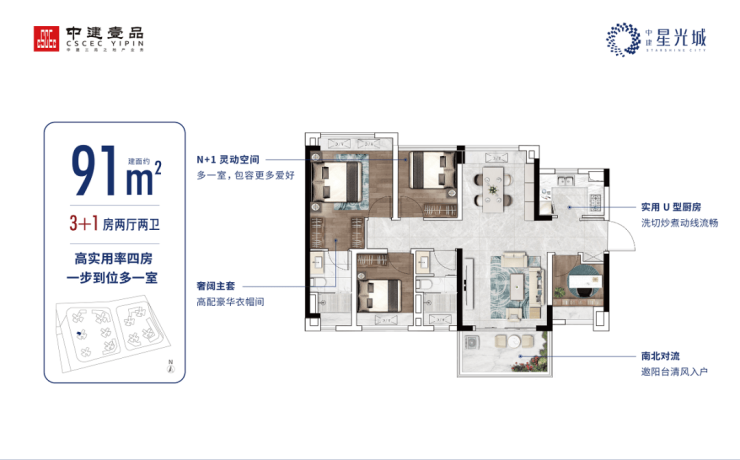 91㎡南北通透四房,视野开阔,户型方正,白云湖区域最具性价比一步到位置业