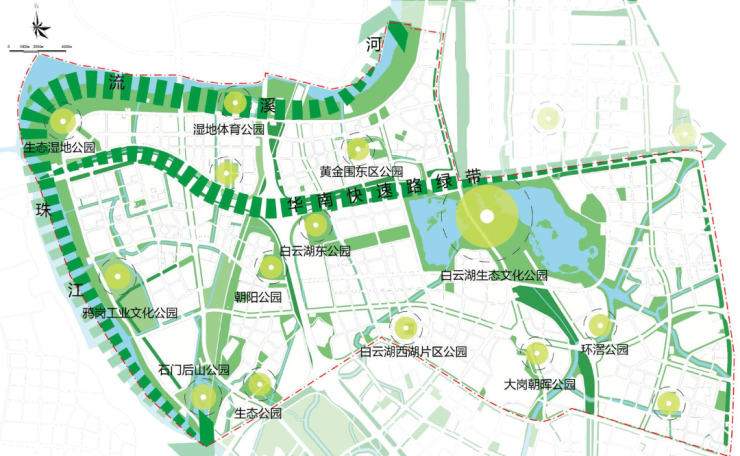 板块生态环境建设更加速发展,以3000亩白云湖和珠水湿地为基底,构建绿湖花海珠水环抱点轴共生景观格局,建设300m进公园的优质公共生态,为城市提供绿色健康的产业办公和生活环境。
