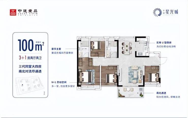 100㎡别墅级户型,大面宽短进深,南北通透,户型方正