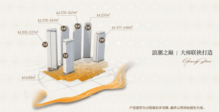 保利南方面粉厂项目总占地面积约47448.67㎡,总建筑面积约175000㎡,容积率3.7,规划6栋住宅,货量约500套。项目以围合式布局打造无风雨归家体系,所有楼栋南向望江,形成“前低后高”的梯级落差,确保后排高层单位亦可越过前排楼栋观赏珠江新城、广州塔及琶洲西区的都市景观。