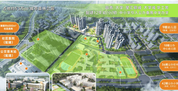 对于有孩子的家庭而言,教育始终是购房决策中的核心考量。星汇锦城在这方面可谓诚意满满:项目配建一所9班幼儿园、42班小学及36班初中,形成完整的12年一站式教育体系,共计提供约3600个学位,远超社区总户数,充分保障每一位业主子女的入学权益。