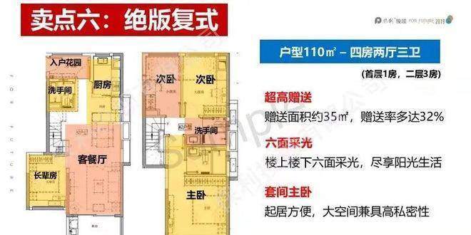 舒适宽敞:复式结构让空间更加开阔,客厅挑高设计,增加了空间的通透感和大气感。加上较高的使用率和额外赠送的 36 方面积,让整个居住空间更加舒适宽敞。