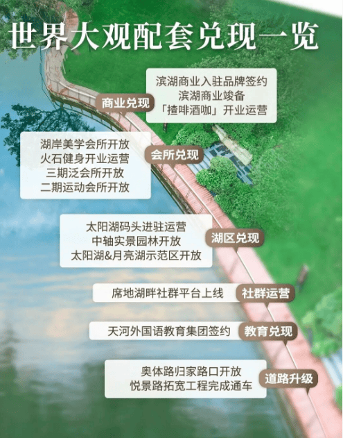 答: 天河国际湖区采用的是“配套先行”的开发模式。自2023年启动以来,板块内的日月双湖水体净化与景观改造、主要路网建设已基本完成,部分主题公园、环湖绿道已实景呈现,三大会所中的部分已开放或即将开放。樾湖天地滨湖商业体正在建设中。教育、医疗等规划配套也在持续推进。可以说,板块的核心生态骨架与关键配套已从图纸快速转化为实景,确定性极高,而非停留在远期规划阶段。这种“先配套,后住宅”的模式,确保了业主未来入住时即能享受成熟、优质的生活环境。