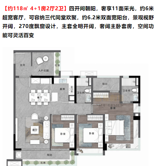 约118㎡ 4+1房2厅2卫:四开间朝阳,约6.2米双面宽阳台,主套全明开阔。