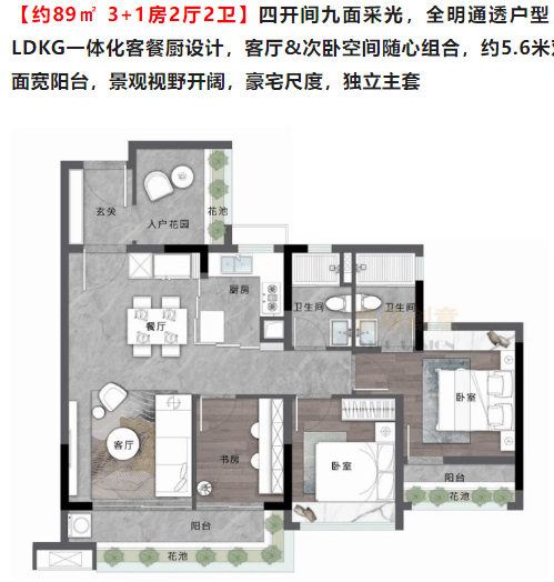 约89㎡ 3+1房2厅2卫:四开间九面采光,LDKG一体化设计,约5.6米双面宽阳台。
