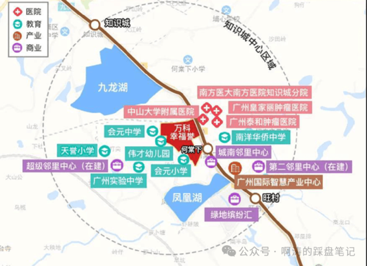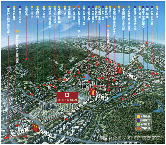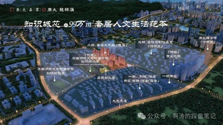 板块内已注册入驻企业数量达到 14566 家,汇聚八大核心产业赛道,集聚大量独角兽企业、行业龙头企业与全球企业区域总部,高精尖产业人群持续导入,形成稳定的高端消费圈层与居住需求。2023 年知识城固定投资目标达到 1200 亿元,占据黄埔区整体固投比重百分之五十,城市基建升级、公共配套落地、生态环境改造持续提速。区域重点打造环九龙湖总部经济发展带,规划建设城市核心功能区、生态休闲绿心与市民综合活动中心,同步引进海内外顶尖科研院所、重点高校实验室、创新研发中心,以知识创新与科技创新为核心,打造高品质滨水综合城区。康大龙祥汇立足知识城极核地段,三公里半径内全覆盖区域核心发展资源,深度承接板块规划红利,房产长期保值增值属性突出,是黄埔北部科创板块优质的宜居与资产双优项目。