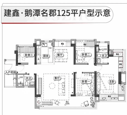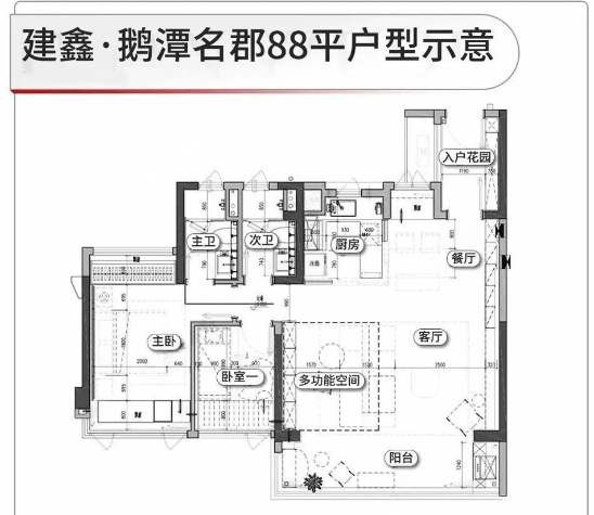 项目主推 88-125㎡三至四房,新规使用率超 100%,全南向 T5 风车型布局确保每户采光与通风。88㎡三房为入门爆款,6.2 米超大阳台 + 独立入户花园,主卧带大飘窗,空间灵活可拓展,满足年轻家庭过渡需求;105㎡三房舒适度升级,6.5 米阳台连接客厅与次卧,LDK 客餐厨一体化,适配三口之家;125㎡四房为改善首选,8.3 米阔景阳台 + 四开间朝南,全屋采光面最大化,部分户型可享江景,主卧套间带独立卫浴与步入式衣帽间,满足多代同堂需求,所有户型均贴合刚需家庭对 “空间利用率” 与 “采光” 的核心需求。