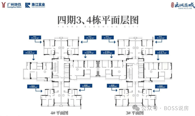 A1:目前在售主要为四期新增产品,包括72㎡三房、88㎡四房、112㎡四房、117㎡五房、119㎡五房等户型。一、二、三期基本无多余单位,主要以清尾货为主。