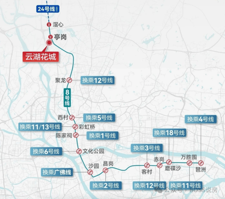 广州地铁8号线作为连接五大城区的重要轨道交通线,其沿线发展日益成熟。项目紧邻亭岗站,通过8号线可实现13条线路换乘,快速通达全城各主要商圈和办公区域,通勤效率大幅提升,为业主节省大量出行时间成本。