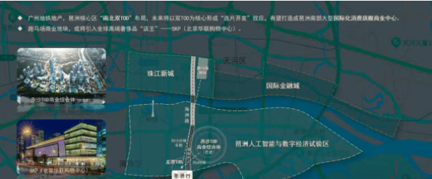 珑璟台临近三大世界级商圈,依靠一江两岸融合发展,有望打造成全国前列的世界级-超级商圈。同时,广州地铁地产还在琶洲核心区布局了南北双TOD旗舰商业,未来将打造成琶洲南部国际化旗舰商业中心。