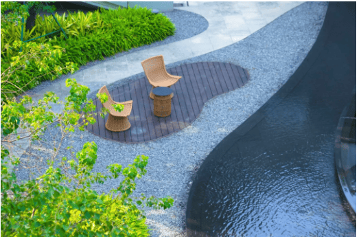 此外,园林中还设有掩映在绿植中的休息区、活动区,更能看出项目对生活的考量,业主漫步于其中,可以随时坐下,全身心去感悟自然之美,也可以与邻里交流谈心,增进邻里情谊。这种园林设计,不仅令业主在回家时感受到尊崇和宁静,也为他们营造了一个与自然亲近的居住空间,提升居住舒适度与幸福感。