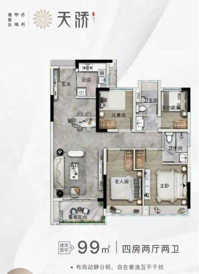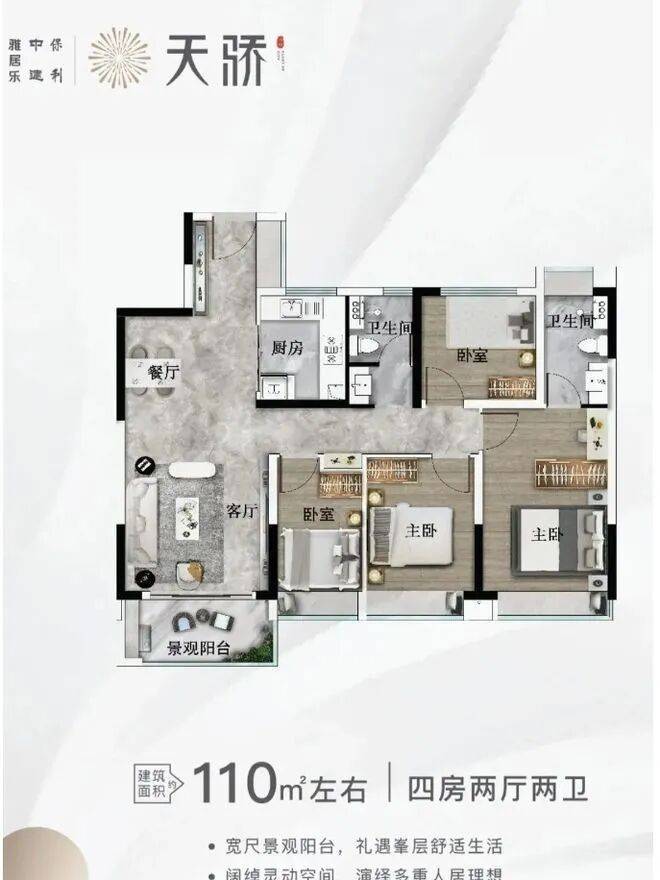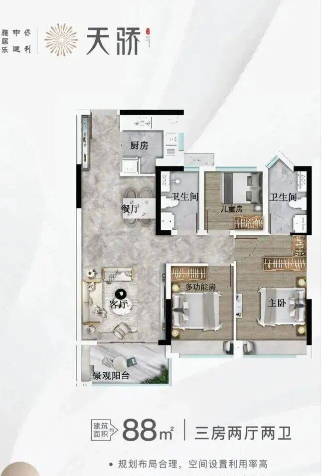 雅居乐保利中建・天骄提供多种户型以满足不同家庭的需求。对于刚需购房者,项目设计了注重空间高效利用与功能合理性的中小户型,布局紧凑,能够在有限面积内实现卧室、客厅、厨房、卫生间等基本功能的完备。而对于改善型家庭,项目提供了更为宽敞的户型,空间开阔,部分户型可能配备大阳台或飘窗,增加了采光与观景视野,提升了居住品质。
