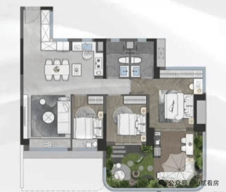 该户型把赠送面积都给了工区和主卧,全屋做到4+1房,空中花园连通公区,面积达到73㎡。最牛的是,主卧还带约14㎡的空中花园,打造一个私享庭院。