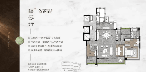 268㎡五房两厅三卫:旗舰户型,3T2户设计,保姆电梯独立分区,270度全景飘窗,豪华配置。