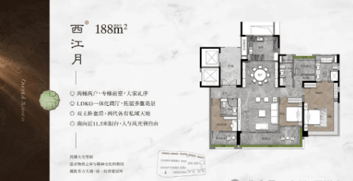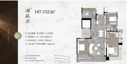 143㎡四房两厅两卫:专梯入户,超大面宽客厅,双主卧设计,满足大家庭需求。