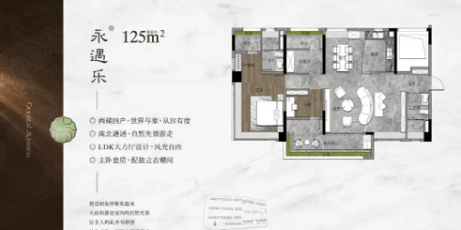125㎡四房两厅两卫:全明户型,大开间客厅,主卧套房设计,带有步入式衣帽间。