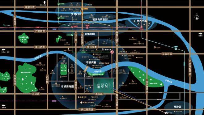 项目雄踞于番禺核心发展轴线——番禺大道与市桥河交汇处,隶属于发展成熟的桥南板块。这里北接番禺广场TOD超级枢纽,西临市桥河生态走廊,东靠番禺传统宜居腹地。板块经过多年发展,城市界面成熟,生活气息浓郁,商业、教育、医疗等基础配套一应俱全。晴翠府的落子,填补了该区域近年缺乏品牌新房供应的空白,为本地改善客群及新广州人提供了一个占据成熟地段、享受现成配套的优质选项,无需等待漫长的配套建设期。