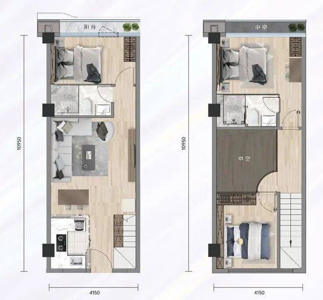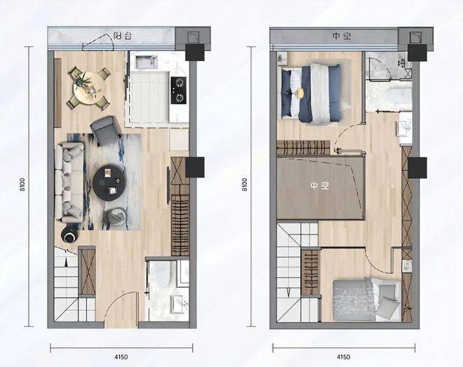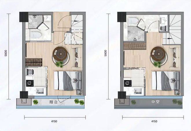 58㎡的户型则是三卧室配置,还带双主套,适合多人居住或者改善型投资。U型厨房动线合理,洗切煮一气呵成。中空设计让室内更有层次,4.15米开间保证每个房间都不压抑。这样的户型在小面积段里非常全能,自住能住得体面,出租收益也更有竞争力。