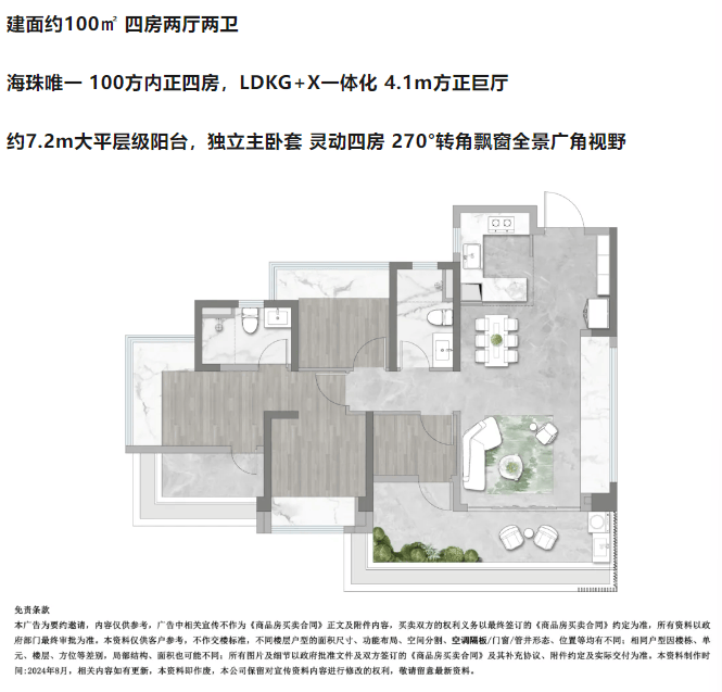 100㎡的四房两厅两卫户型,是区域内极为罕见的100㎡内正四房设计。这对于多孩家庭来说,简直是完美的解决方案。四个房间布局合理,互不干扰,每个家庭成员都有自己的独立空间。4.1米的方正客厅连接着7.2米的大阳台,阳台面积超大,既可以晾晒衣物,也可以摆放桌椅,成为家庭的休闲第二客厅。主卧同样配备了270°转角飘窗,实用性和美观性兼具。