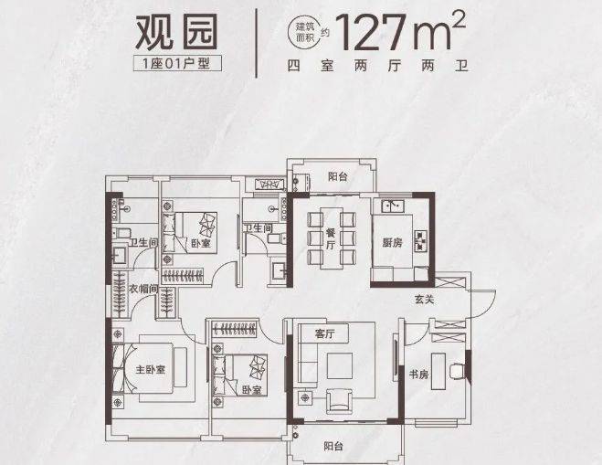 127㎡户型采用正统的南北双阳台设计,且四开间朝南,户型方正。南北双阳台保证了空气的对流与充足的采光,四开间朝南使得每个房间都能充分享受阳光的眷顾,极大提升了居住舒适度。客厅宽敞大气,连接观景阳台,可作为家庭聚会与休闲娱乐的主要场所。餐厅与厨房紧密相连,方便用餐。主卧套房设计,配备独立卫生间,提升居住私密性。次卧和书房布局合理,可满足家庭成员不同的居住与生活需求,无论是二孩家庭还是三代同堂,都能在这个空间里找到舒适的生活方式。