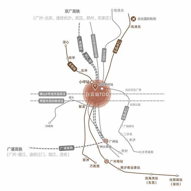 白云站作为亚洲规模领先的综合交通枢纽,在整体规划中承担着连接全国、通达世界的重要使命。其约263万㎡的体量形成强大交通引擎,集高铁、城轨、地铁等多重交通方式于一体,使城市能量在此汇聚辐射。项目距离白云站核心区直线可及,地铁多线交织覆盖,京广高铁、广湛高铁等线路通达南北,多条城轨与地铁构筑立体交通网络,形成真正意义上的“上盖枢纽生活圈”。便捷的交通体系让商务往来更高效,也让居住体验更具国际都会属性。