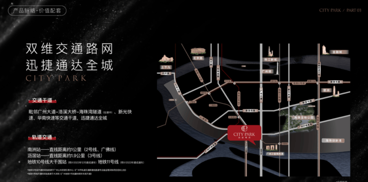 中国铁建・西派粤府坐落于广州城市新中轴与海珠创新湾的双轴交汇处,占据城市南门户的重要位置。广州城市新中轴贯穿天河北、珠江新城、广州塔,项目落点于新中轴最后一公里,尽享全城资源利好。而海珠创新湾作为海珠区十四五规划重点,致力于构建展示珠江城市品牌、传承广州文化基因、集聚现代化科创要素的新城市轴线核心门户。于此,项目打造 20 分钟精致生活圈,涵盖双维交通路网、高端商圈、学府以及三甲医疗资源,生活便捷且丰富。